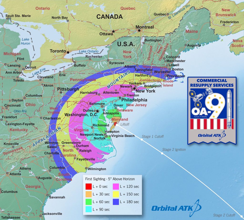 Launch of the OA-9 mission is currently scheduled to occur within a 5 minute window starting at 4:39 AM EDT / 08:39 UTC. Orbital ATK plans to target the start of the window for liftoff.